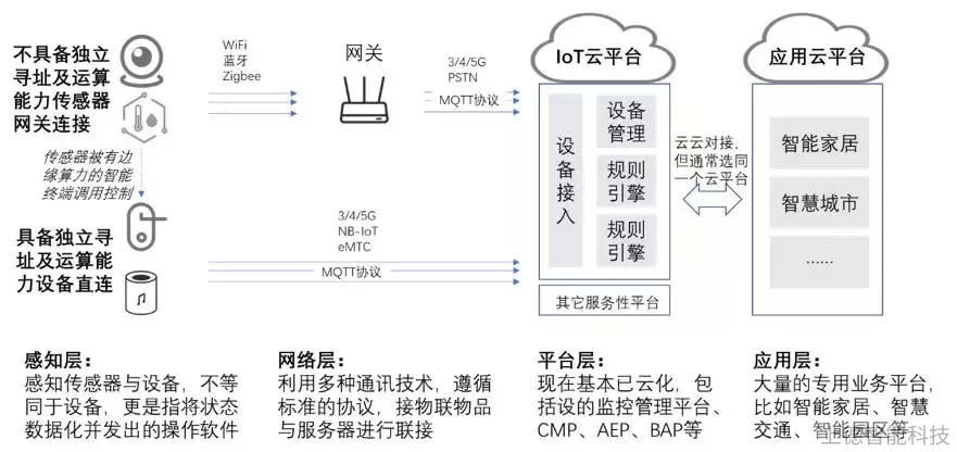 物聯(lián)網(wǎng)常分為四層:感知、網(wǎng)絡(luò)、平臺和應(yīng)用層;也有另一種常見的分法,是把平臺層并入應(yīng)用層,因此定義為感知、網(wǎng)絡(luò)和應(yīng)用層。各層的組成和對應(yīng)關(guān)系如下: