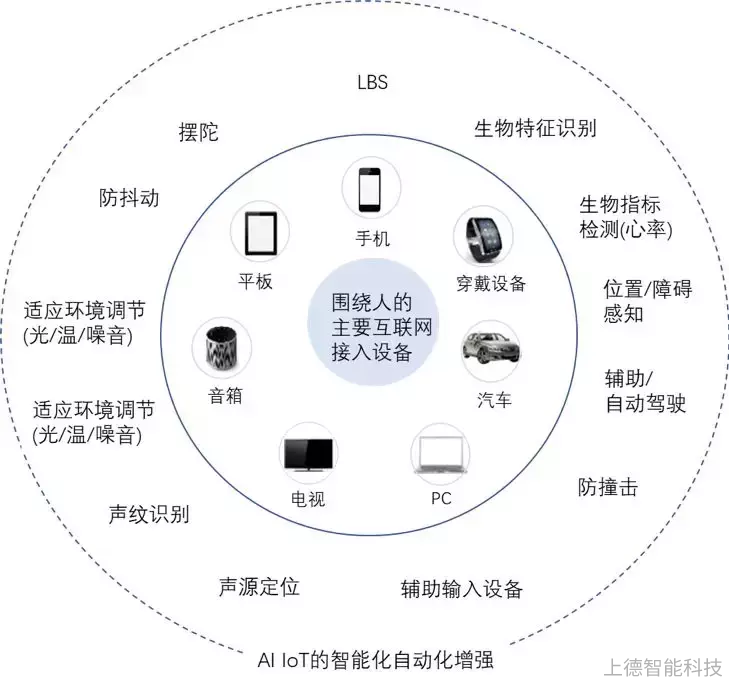 以下的圖示,簡單地羅列了未來常見的互聯(lián)網(wǎng)接入設(shè)備,如何日益集成更多的IoT設(shè)備,并在人工智能的輔助下,實現(xiàn)更智能、更強大的功能,從而更好地提高原來互聯(lián)網(wǎng)應(yīng)用的體驗: